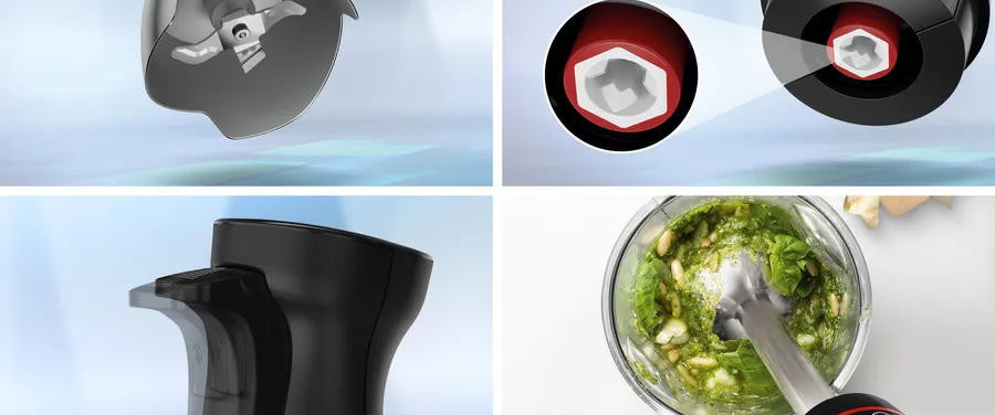 Особенностью данной модели является наличие 4-х лезвийного ножа QuattroBlade, который обеспечивает быстрое и равномерное измельчение продуктов. Блендер оснащен универсальной чашей с ножом для измельчения твердых продуктов, что делает его идеальным инструментом для приготовления разнообразных блюд. Кроме того, прибор имеет бесступенчатую регулировку скорости, что позволяет точно настраивать процесс измельчения в зависимости от конкретной задачи. Особое внимание заслуживает эргономичная ручка блендера, которая обеспечивает удобство и комфорт при использовании. Мерный стакан, входящий в комплект, позволяет легко измерять необходимое количество ингредиентов. Детали блендера можно легко снять и помыть в посудомоечной машине, что значительно упрощает процесс уборки после приготовления пищи.