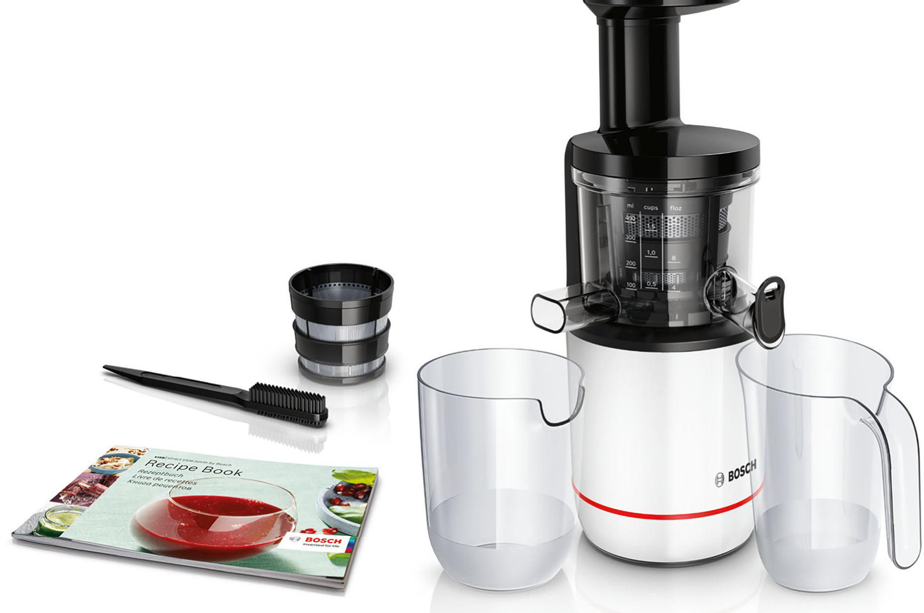 В комплекте прилагаются два фильтра с мелкими отверстиями для сока и крупными для смузи. Для удобства предусмотрен буклет с рецептами.