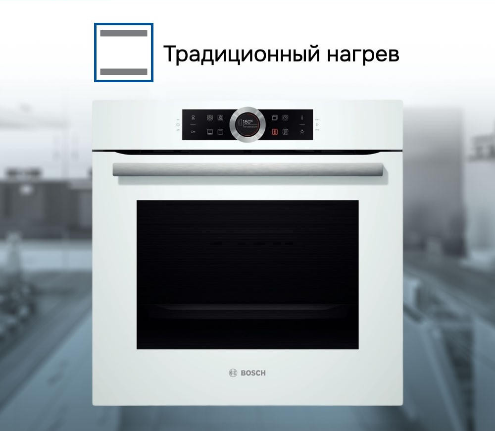 Духовой шкаф Bosch HBG634BW1 оснащен эргономичной панелью управления с поворотным переключателем Control Ring. Сенсорный дисплей с отображением меню, включающим все возможные подсказки и советы. Дополнительная кнопка «Info» значительно упростит выбор режима.