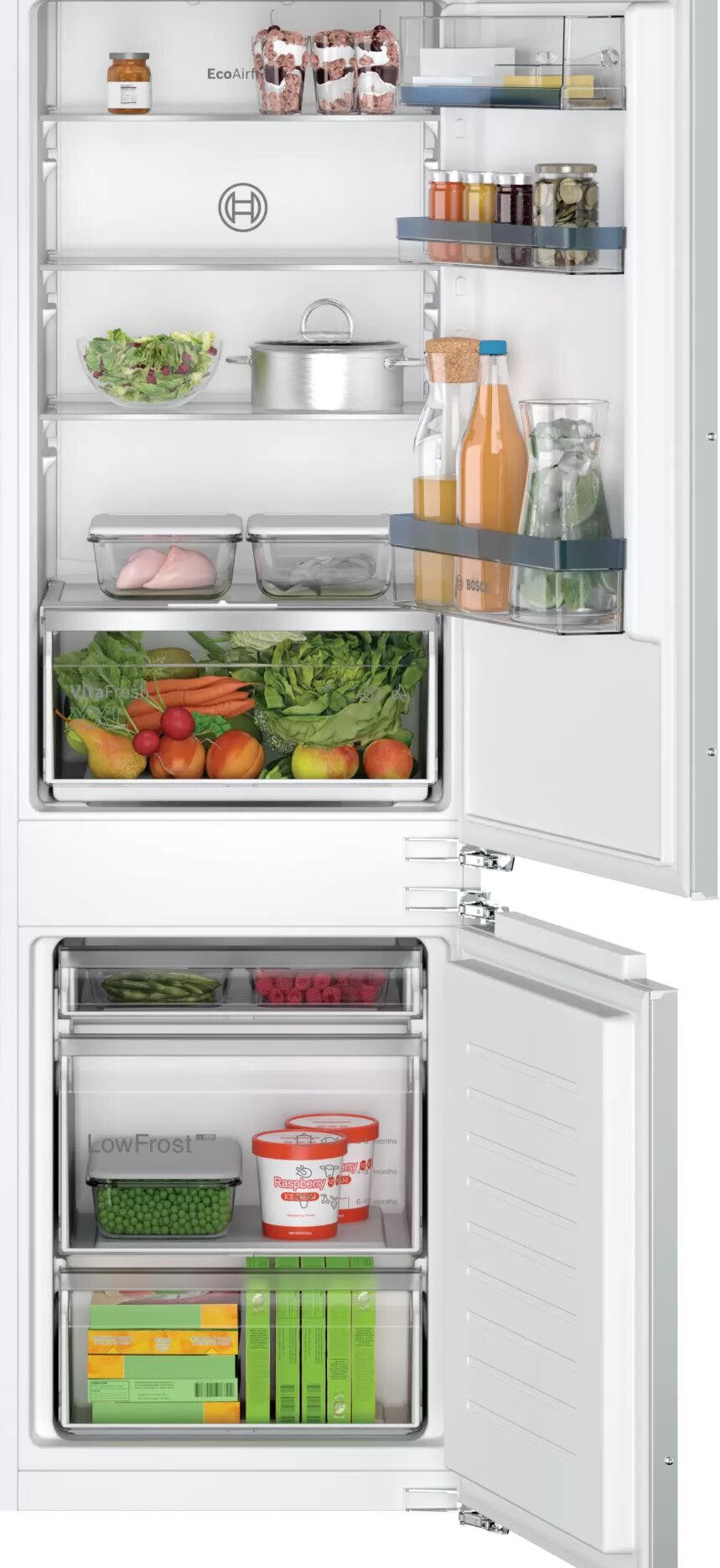 Хочу поделиться впечатлениями от встраиваемого холодильника Bosch KIV86VFE1 — он стал настоящей находкой для нашей кухни! Во-первых, очень радует его двухкамерная конструкция с морозильником снизу: это не только удобно с точки зрения эргономики (чаще пользуешься холодильной камерой, и она на уровне глаз), но и выглядит стильно и современно. Встроенный дизайн идеально вписался в наш гарнитур — теперь кухня выглядит цельной и аккуратной, без выступающих частей. Объём холодильной камеры (183 литра) для семьи из трёх человек более чем достаточен: всё размещается без толкотни, особенно нравится грамотная организация пространства — полки регулируются по высоте, а ящики для овощей герметичные и вместительные. Морозильная камера на 84 литра тоже радует: уместилось всё, что нужно на пару недель вперёд, включая замороженные ягоды, мясо и даже запасы на праздники. Уровень шума минимальный — ночью вообще не слышно, а это для меня очень важно, ведь кухня у нас совмещена со спальней.