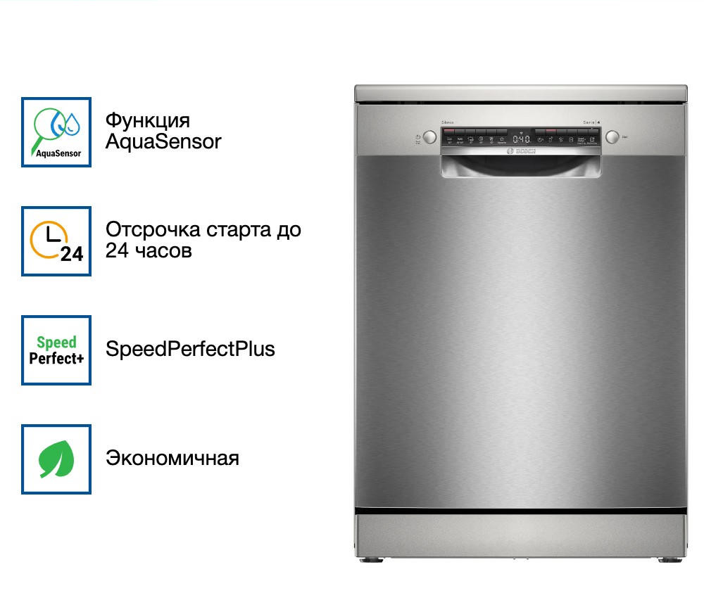Посудомоечная машина Bosch SMS4HVI00E стала настоящим спасением на моей кухне. Особенно ценю её вместительность — 14 комплектов позволяют загрузить всё: от кастрюль после ужина до бокалов и столовых приборов, даже если гости остались на ночь. Инверторный двигатель EcoSilence Drive работает практически бесшумно, что особенно приятно вечером или ночью — никакого раздражающего гула, только тихий шелест воды. Функция SpeedPerfectPlus просто волшебна: когда нужно быстро освободить место на столе, за полчаса посуда уже чистая и сухая. Также очень удобна автоматическая программа — машина сама определяет степень загрязнения и подбирает нужный цикл, экономя воду и электроэнергию. А благодаря Home Connect я могу запустить мойку даже из другой комнаты — например, пока укладываю ребёнка спать.