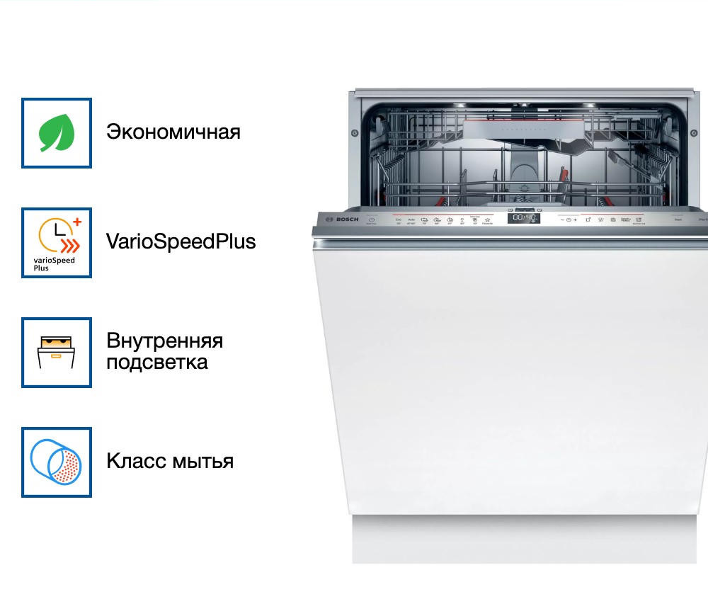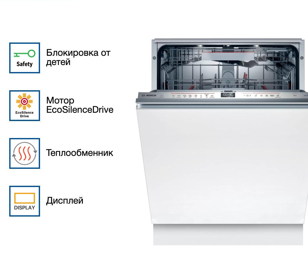 Встраиваемая посудомоечная машина Bosch SMD6ZDX49E из серии Serie 6 стала для меня настоящим спасением на кухне. Как женщина, которая часто готовит для семьи и любит принимать гостей, я больше не трачу вечера на то, чтобы стоять у раковины с губкой и перчатками. Машина легко справляется с 13 комплектами посуды — это значит, что даже после праздничного ужина я могу загрузить всё: от больших сковородок и форм для запекания до бокалов и чашек — и быть уверенной, что утром всё будет чистым и блестящим. Особенно ценю технологию сушки с теплообменником: посуда выходит полностью сухой, без разводов и капель, даже пластиковые контейнеры! Раньше это было моей головной болью, но теперь — никаких проблем. А ещё впечатляет инверторный двигатель EcoSilence Drive — работает практически бесшумно. Я спокойно запускаю цикл ночью или во время разговора за чаем, и никто не замечает, что машина работает. Белая панель управления выглядит аккуратно и лаконично, идеально вписывается в фасад кухонного гарнитура, не привлекая лишнего внимания.
