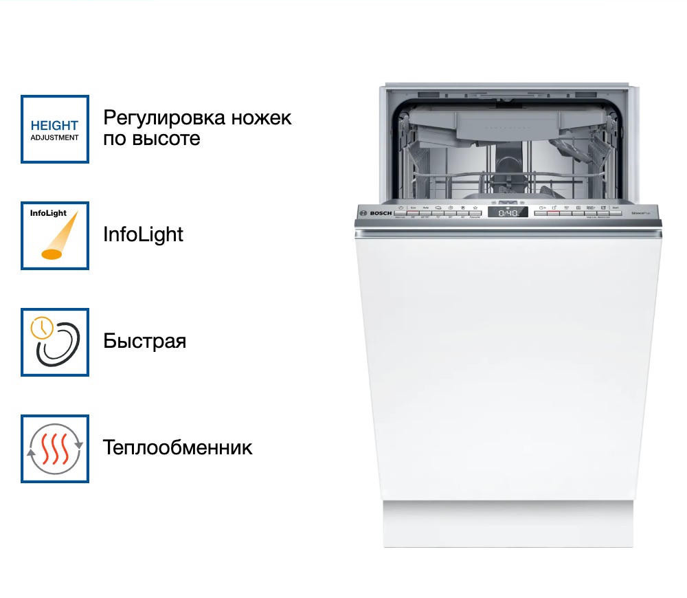 С тех пор как в мою кухню встроили эту узкую Bosch SPV4HMX10E, мой быт преобразился до неузнаваемости. Особенно ценю тишину её работы — инверторный двигатель EcoSilence Drive работает так незаметно, что я часто проверяю через приложение Home Connect, не завершился ли цикл: никакого гула, только лёгкое журчание воды. А когда нужно срочно вымыть посуду перед приходом гостей, VarioSpeedPlus спасает — за 58 минут получается идеально чистая посуда даже после запеканки или жирного борща. Отдельный восторг — луч InfoLight на полу: пока я готовлю ужин или убираю со стола, не нужно подходить к машине, чтобы узнать статус — красная точка на полу мягко напоминает, что процесс идёт, а когда гаснет, я точно знаю: можно расставлять чашки и тарелки по местам. Сушка через теплообменник тоже порадовала: даже пластиковые контейнеры для ланча вынимаю полностью сухими, без разводов и капель.