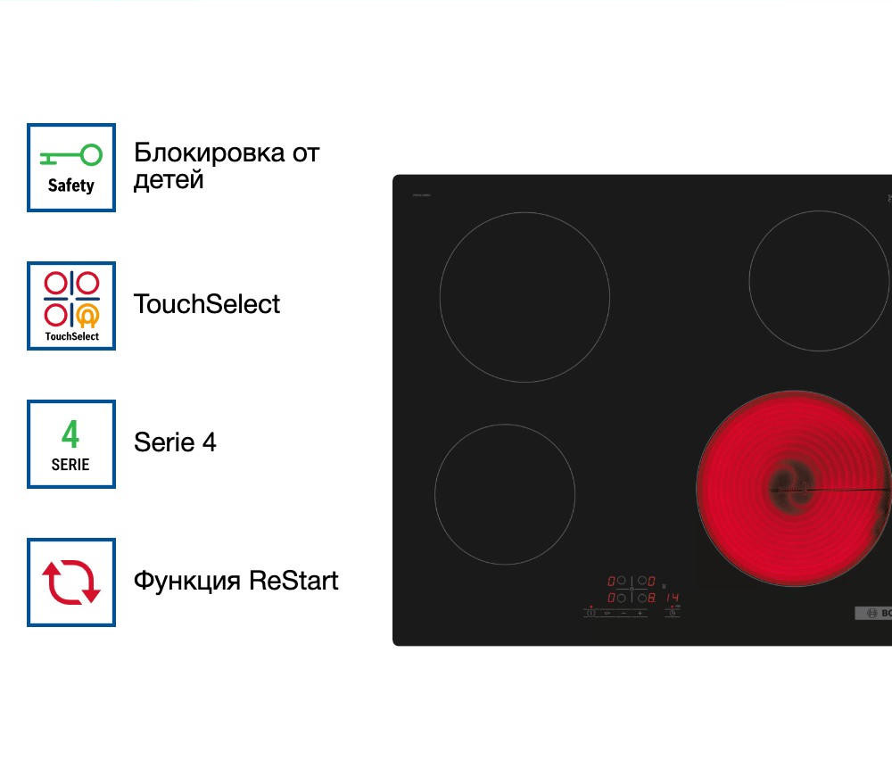 Плита Bosch Serie | 4 уже несколько месяцев радует меня своей безупречной работой и эстетикой. Прежде всего, хочется отметить сенсорное управление TouchSelect — оно невероятно удобное и интуитивно понятное. Достаточно легкого касания, чтобы включить нужную конфорку или точно выставить одну из 17 ступеней мощности. Особенно ценю функцию QuickStart: когда нужно срочно вскипятить воду или разогреть сковороду, плита моментально реагирует и выходит на заданную мощность. Также в восторге от ReStart — если пришлось ненадолго отойти и случайно выключила панель, она запоминает последние настройки и восстанавливает их при повторном включении. Это спасает, когда готовишь в режиме многозадачности. Поверхность из черной стеклокерамики смотрится стильно и легко очищается — никаких царапин или пятен не остается, даже после готовки с маслом или соусами.