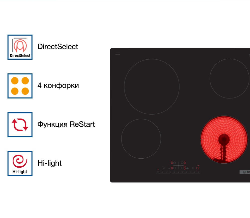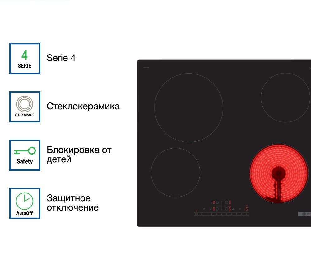 Панель Bosch PKE611FP2E стала настоящим украшением моей кухни — глянцевая черная стеклокерамика выглядит стильно, современно и легко вписывается в любой интерьер. Особенно радует сенсорное управление: оно не только эстетично, но и очень удобно в использовании. Функция DirectSelect позволяет мгновенно выбрать нужную конфорку и уровень нагрева без лишних нажатий — это особенно ценно, когда готовишь несколько блюд одновременно. Очень выручает PowerBoost: за считанные минуты вскипятить воду или быстро разогреть сковороду стало проще простого. Также отмечу наличие 17 ступеней мощности — это даёт невероятную точность в регулировке температуры, что особенно важно при приготовлении деликатных блюд, например, соусов или топлёного молока. Индикатор остаточного тепла и блокировка от детей — приятные «фишки», которые делают эксплуатацию безопасной, особенно если в доме есть маленькие дети.