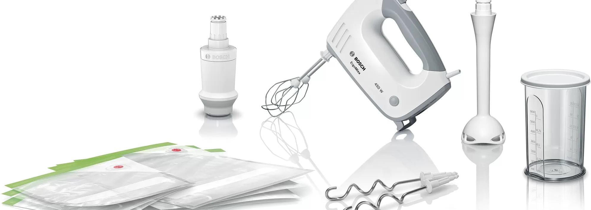 Миксер Bosch MFQ364V0 относится к линейке ErgoMixx и обладает удобной эргономичной ручкой с мягким покрытием Soft-touch и большими кнопками. В приборе имеется функция вакуумирования с 3 пакетами объемом 1,2 и 3,8 л. Ножка блендера из термоустойчивого пластика с ножами из нержавеющей стали легко взобьет или пошинкует различные продукты. Используя пять скоростных режимов, вы можете смешать любой ингредиент до желаемой консистенции, от низкой скорости для смешивания до максимальной для взбивания яичных белков.
