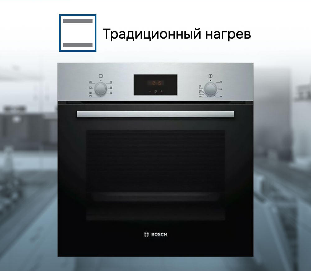 Духовой шкаф Bosch HBF133BR0 — это электрическая независимая модель. Она выполнена в цвете «нержавеющая сталь», благодаря чему отлично вписывается в современный кухонный интерьер. Ее внутренний объем составляет 66 литров, благодаря чему есть возможность запекать большие блюда. Управление осуществляется посредством нажатия кнопок, поворота переключателей, а также использования сенсорных кнопок. Благодаря многофункциональным часам Easy Clock можно с легкостью отслеживать время до окончания работы одной из программ. LED-дисплей имеет высокое качество изображения и устойчив к высоким температурам. Откидная дверца с двухслойным стеклом надежно удерживает пар внутри. Имеются телескопические направляющие, благодаря которым противень легко выдвигается, а риск получения ожога снижен..
