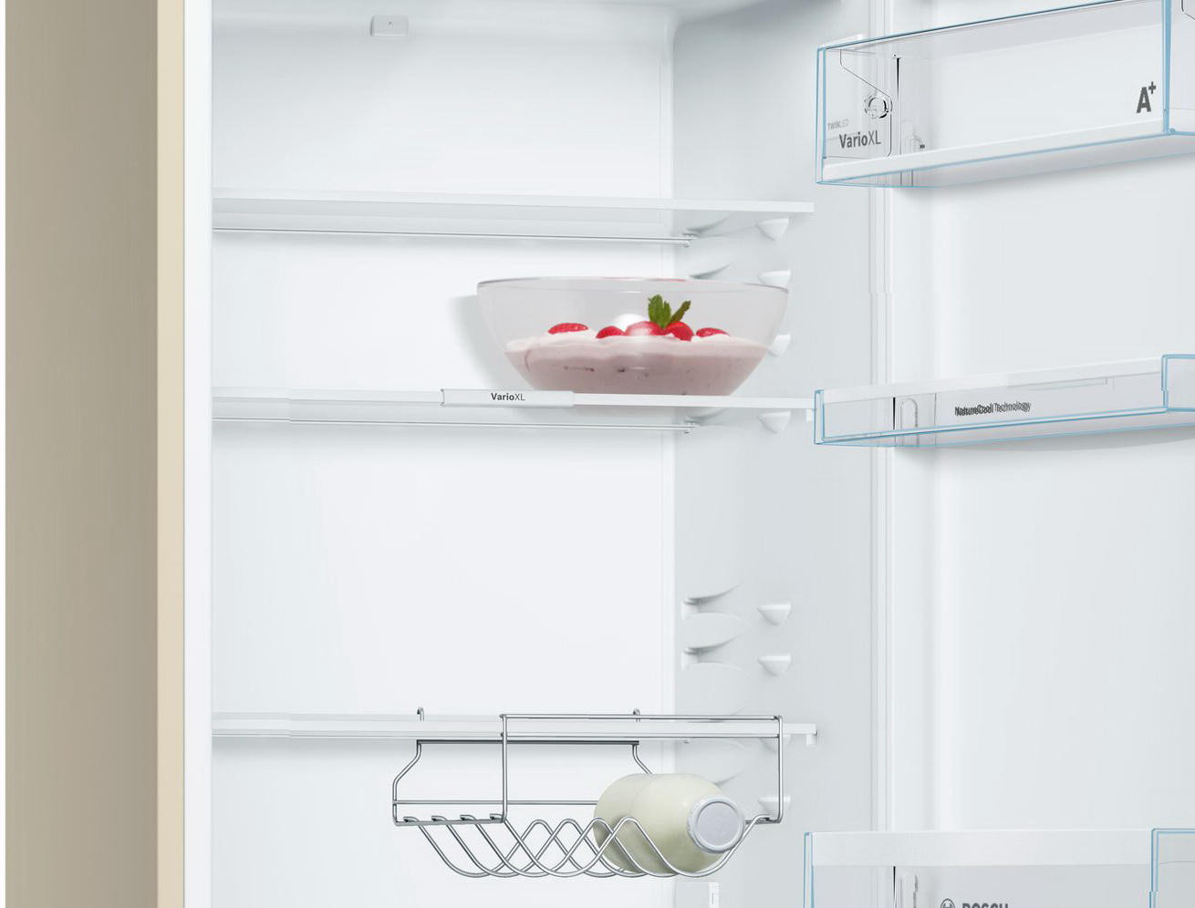 Двухкамерный холодильник Bosch KGV36XK2A бежевого цвета с нижней морозильной камерой — удобная экономичная модель, которая относится к классу эффективности А+. Благодаря системе охлаждения LowFrost образование льда в морозильной камере минимальное. Технология NatureCool поддерживает в холодильнике оптимальную влажность, что позволяет надолго сохранить свежесть овощей и фруктов.