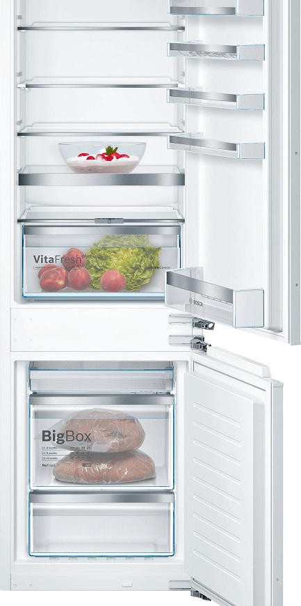 Двухкамерный холодильник Bosch KIN86HD20R — встраиваемая модель с зоной свежести VitaFresh plus. Светодиодная подсветка ярко и равномерно освещает холодильную камеру холодильника. Благодаря системе NoFrost нет необходимости в размораживании прибора. В морозильной камере расположен большой ящик для замороженных продуктов BigBox.