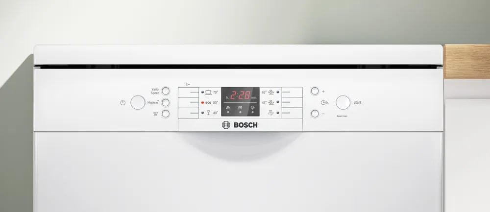 Посудомоечная машина Bosch SMS26AW00Q способна вместить до 12 комплектов покрывает потребности небольшой семьи или пары, при этом комплектность корзин — две полные секции с регулируемой по высоте верхней корзиной на системе Rackmatic-3 — упрощает размещение высоких бокалов, кастрюль и тарелок. В верхнем ящике предусмотрены складные держатели для тарелок (две секции), нижняя камера также оснащена двумя складными элементами для посуды, а внизу располагается удобная корзина для столовых приборов. Пять стандартных программ покрывают самые распространенные сценарии эксплуатации, а индикаторы наличия ополаскивателя и соли, а также отображение времени до окончания цикла помогают контролировать расход средств и планировать бытовые задачи. Функция предварительного ополаскивания поддерживает чистоту при отсрочке запуска, которая может быть установлена от 1 до 24 часов, после завершения программа сопровождается звуковым сигналом.