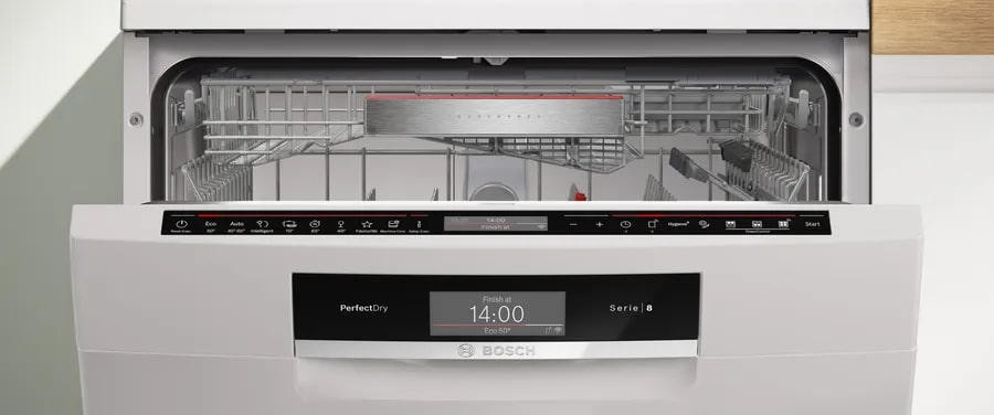 Панель управления открытая, с сенсорными кнопками и дисплеем. Также есть возможность удаленного запуска через приложение на смартфоне благодаря функции Home Connect. Индикаторы наличия ополаскивателя, соли и времени до окончания программы помогают контролировать процесс мытья. Таймер отсрочки запуска позволяет запланировать начало работы машины в удобное для вас время. Машина имеет три корзины, в том числе переставляемую по высоте верхнюю корзину с системой Rackmatic-3 и корзину для столовых приборов в нижнем коробе. Система AquaStop и полная защита от протечек обеспечивают безопасность использования. Блокировка от детей предотвращает случайное включение или изменение программы.