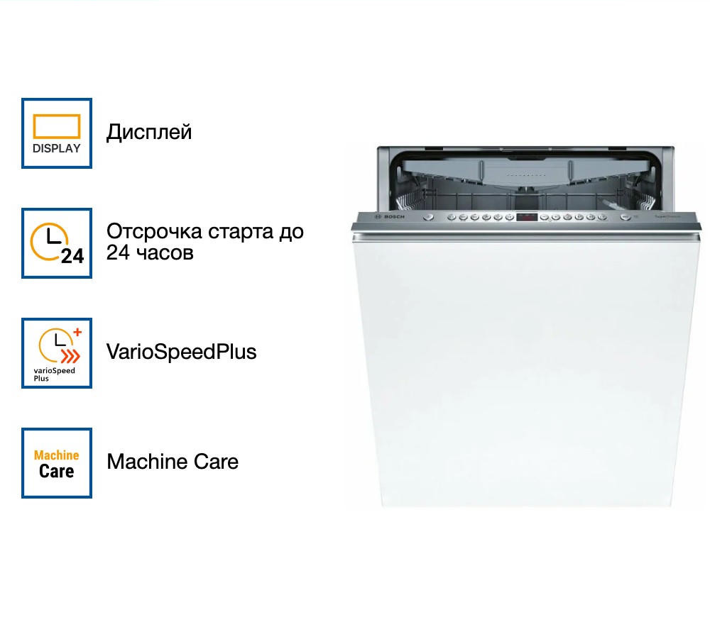 Особенности прибора включают функцию HygienePlus, которая обеспечивает более глубокую очистку посуды, и функцию VarioSpeedPlus, которая ускоряет процесс мытья в три раза, сохраняя при этом качество очистки. Также есть функция Machine Care для поддержания чистоты и долговечности машины, и функция Extra Dry для дополнительной сушки посуды.
