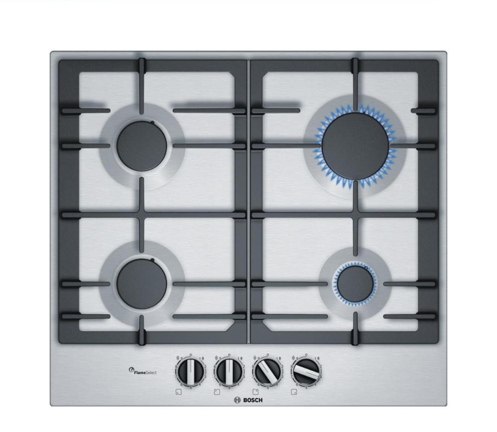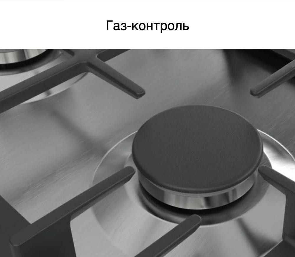 Безопасную эксплуатацию газовой варочной панели Бош PСP6А5B90R осуществляет система газ-контроль, которая подразумевает, что благодаря специальным датчику и клапану при случайном угасании огня газ мгновенно блокируется и перестает поступать — утечка предотвращена. Также важно заметить, что оборудование обладает удобными габаритами для встраивания, и оно не займет много места на вашей кухни: высота — 4,5 см, ширина — 58,2 см, глубина — 52 см.
